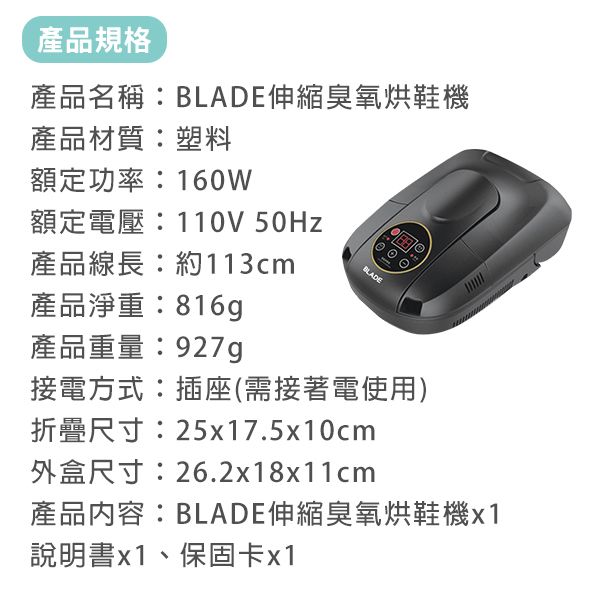 產品內容:BLADE伸縮臭氧烘鞋機x1、說明書x1、保固卡x1