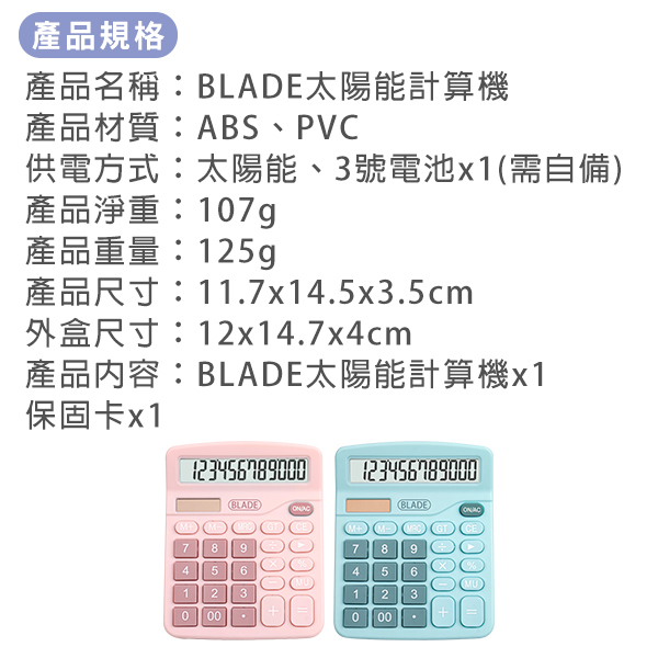 產品內容:BLADE太陽能計算機x1、保固卡x1