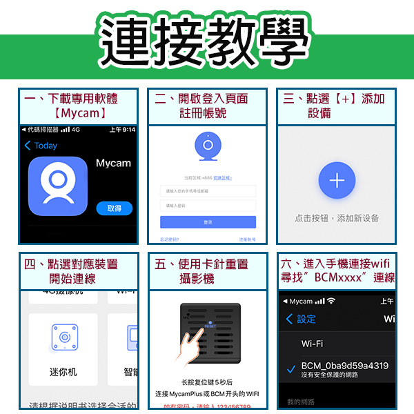 ●下載 [mycam]→註冊/登入→點選 [迷你機]→連接指定WiFi→等待WiFi連接成功回APP→即可觀看