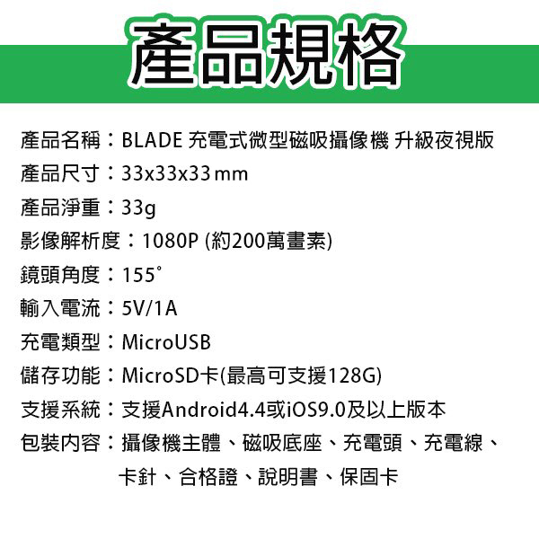 產品名稱:BLADE充電式微型磁吸攝像機 升級夜視版