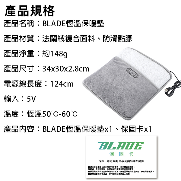 產品內容:BLADE恆溫保暖墊x1、保固卡x1