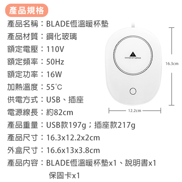 產品內容:BLADE恆溫暖杯墊x1、說明書x1、保固卡x1