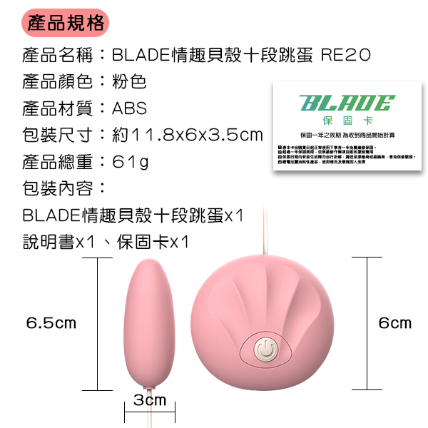 包裝內容:BLADE情趣貝殼十段跳蛋x1、說明書x1、保固卡x1