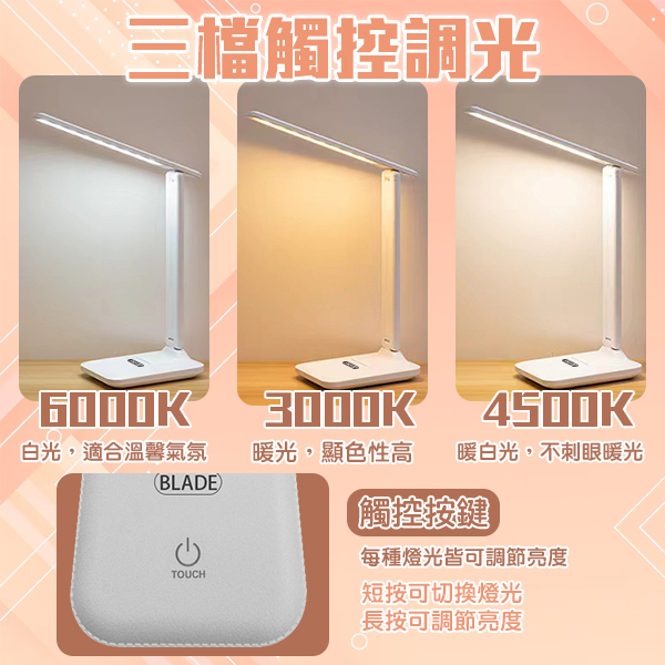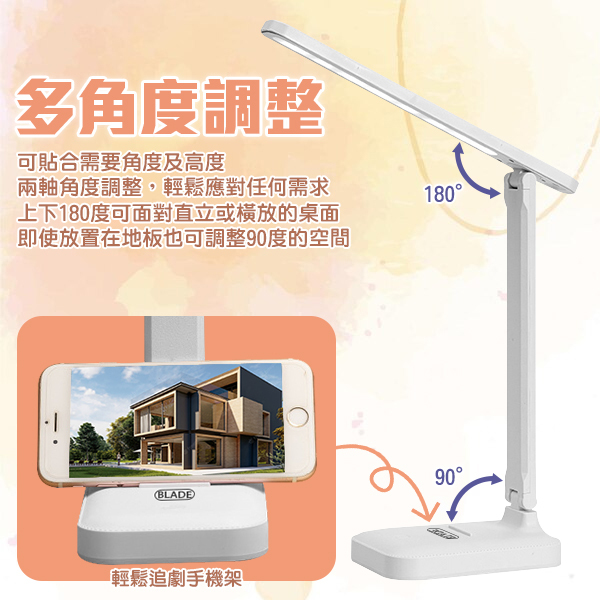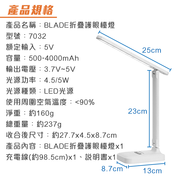 產品內容:BLADE折疊護眼檯燈x1、充電線(約98.5cm)x1、說明書x1