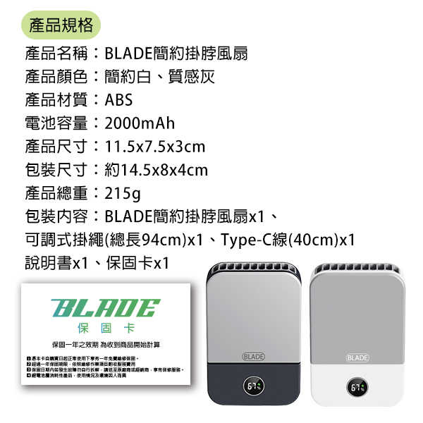 包裝內容:BLADE簡約掛脖風扇x1、可調式掛繩(總長94cm)x1、Type-C線(40cm)x1、說明書x1、保固卡x1