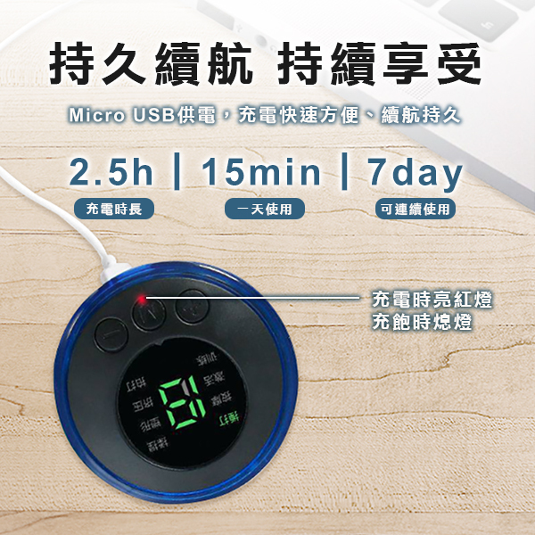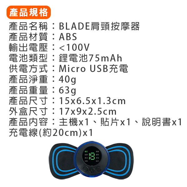 產品內容:主機x1、貼片x1、說明書x1、充電線(約20cm)x1