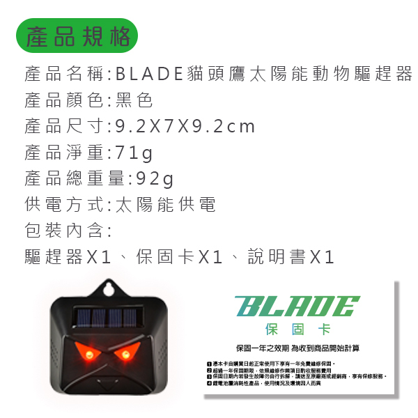 產品名稱:BLADE貓頭鷹太陽能動物驅趕器