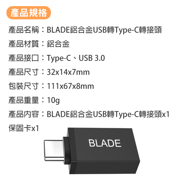 產品內容:BLADE鋁合金USB轉Type-C轉接頭x1、保固卡x1