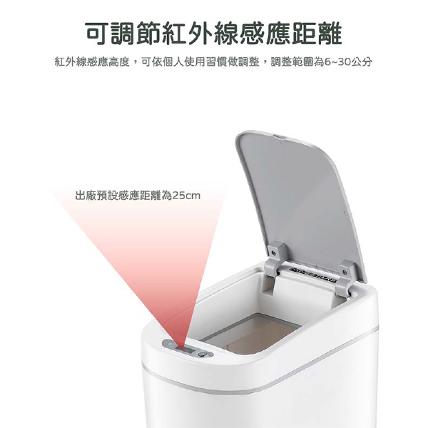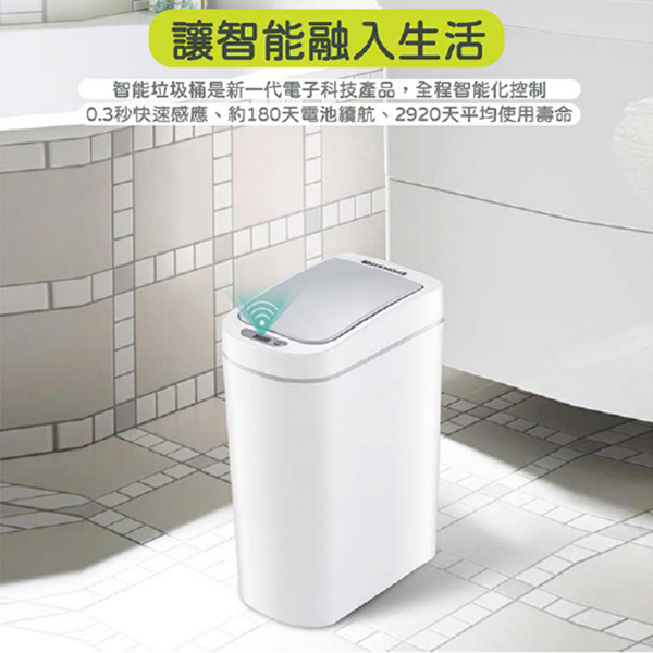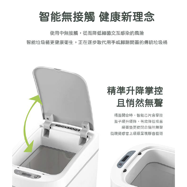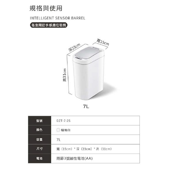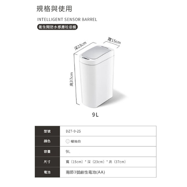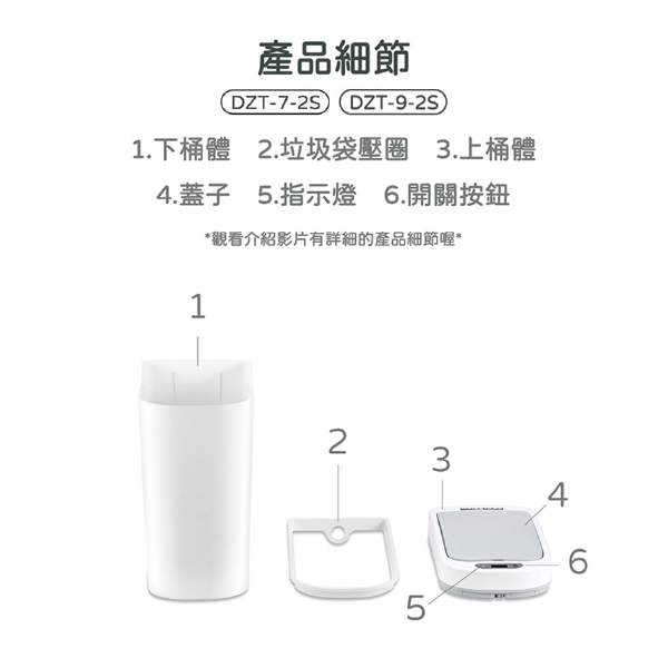 產品內容:桶蓋x1、桶身x1、垃圾袋壓圈x1、3號電池x2、說明書x1