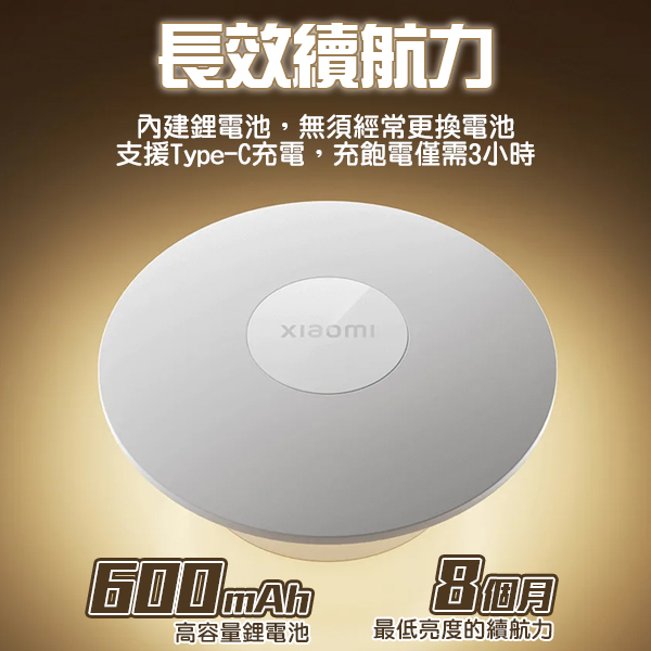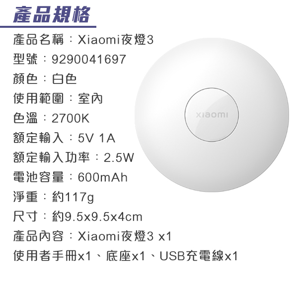 產品內容:Xiaomi夜燈3 x1、使用者手冊x1、底座x1、USB充電線x1