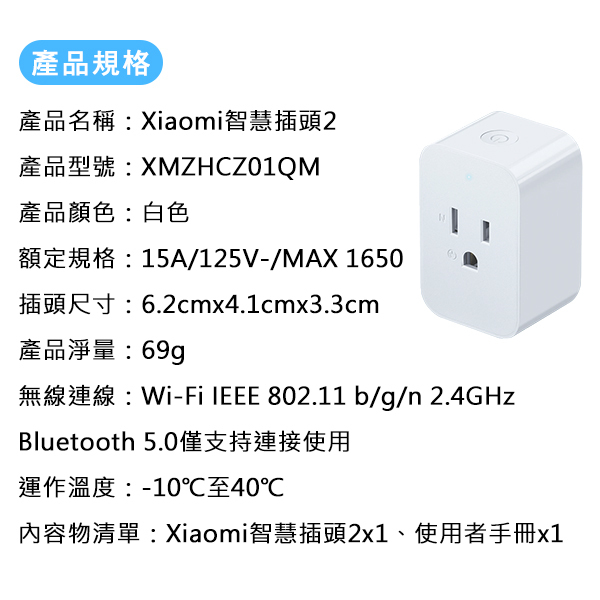 內容物清單:Xiaomi智慧插座2x1、使用者手冊x1