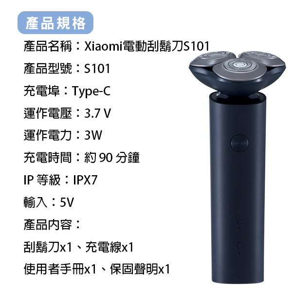 產品內容:刮鬍刀x1、充電線x1、使用者手冊x1、保固聲明x1