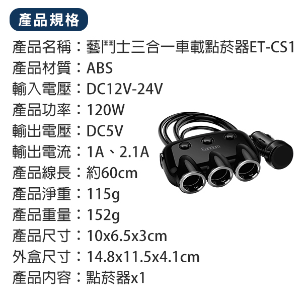 產品名稱:藝鬥士三合一車載點菸器ET-CS1
