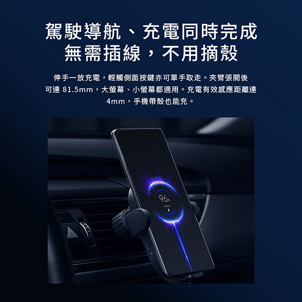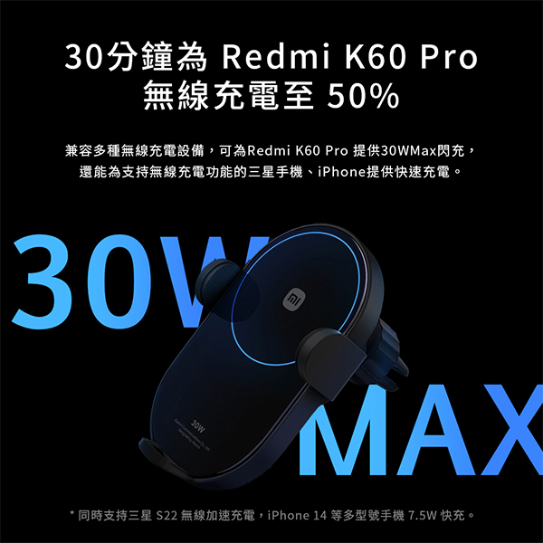 產品內容:小米無線車充30Wx1、電源線(100cm)x1、鴨嘴夾x1、平面黏貼底座x1、說明書x1、適配器x1