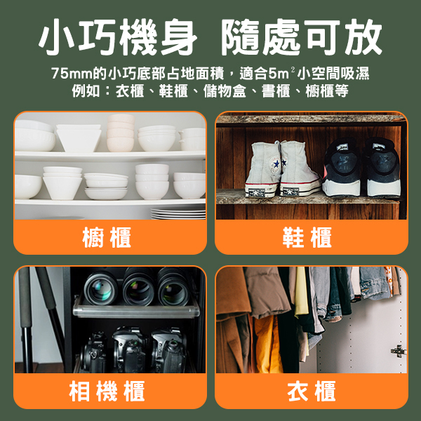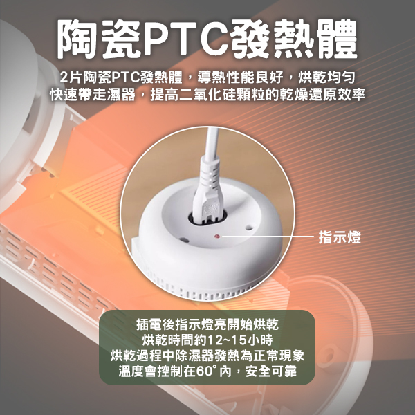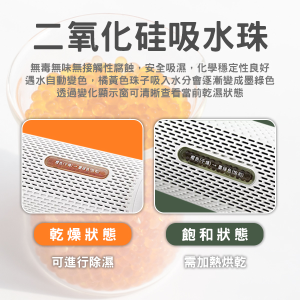 遇水自動變色,橘黃色可進行除濕,墨綠色則需插電加熱烘乾