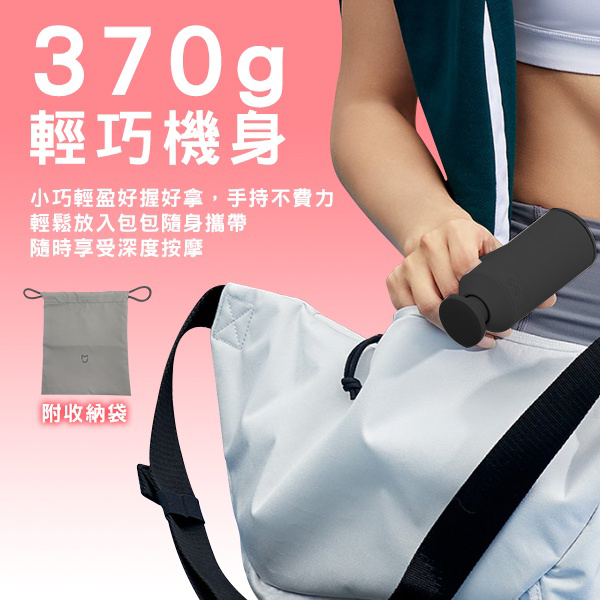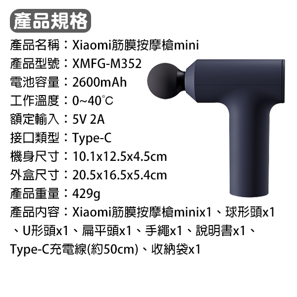 產品內容:Xiaomi筋膜按摩槍minix1、球形頭x1、U形頭x1、扁平頭x1、手繩x1、說明書x1、Type-C充電線(約50cm)、收納袋x1
