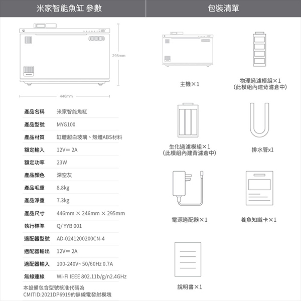 排水管x1、電源適配器x1、養魚知識卡x1、說明書x1