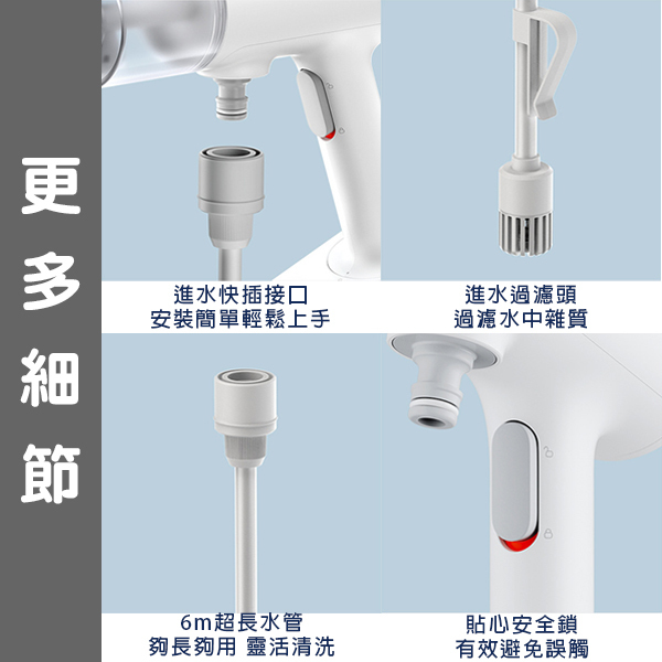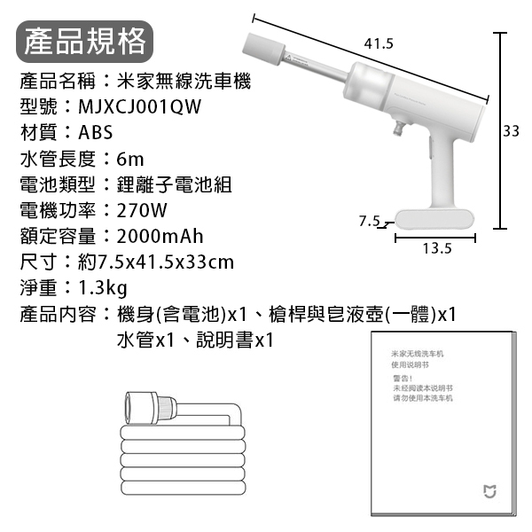 產品內容:機身(含電池)x1、槍桿與皂液壺(一體)x1、水管x1、說明書x1