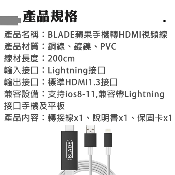 產品名稱:BLADE蘋果手機轉HDMI視頻線